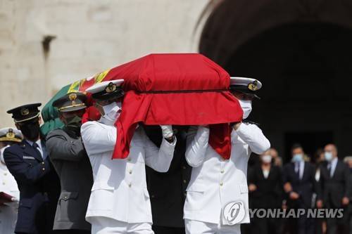 Air Force, Army and Navy officers carry the flag-draped coffin during the State Funeral of former Portuguese President Jorge Sampaio at the Jeronimos Monastery in Lisbon, Sunday, Sept. 12, 2021. Sampaio, a former two-term president of Portugal and one of the most prominent political figures of his generation, died Friday. He was 81. (AP Photo/Armando Franca)