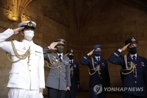 Air Force, Army and Navy officers salute during the State Funeral of former Portuguese President Jorge Sampaio at the Jeronimos Monastery in Lisbon, Sunday, Sept. 12, 2021. Sampaio, a former two-term president of Portugal and one of the most prominent political figures of his generation, died Friday. He was 81. (AP Photo/Armando Franca)