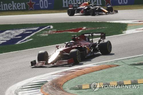 epa09463525 Monaco's Formula One driver Charles Leclerc (front) of Scuderia Ferrari Mission Winnow and Mexican Formula One driver Sergio Perez of Red Bull Racing in action during the start of the Formula One Grand Prix of Italy at the Autodromo Nazionale Monza race track in Monza, Italy, 12 September 2021. EPA/MATTEO BAZZI