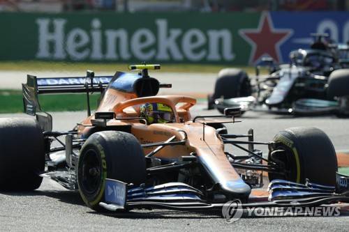 Mclaren driver Lando Norris of Britain steers his car during the Italian Formula One Grand Prix, at Monza racetrack, in Monza, Italy, Sunday, Sept.12, 2021. (AP Photo/Luca Bruno)