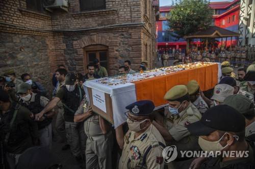 Indian police officers carry the coffin of their colleague Arshad Mir during a wreath laying ceremony in Srinagar, India, Sunday, Sept. 12, 2021. Mir was killed in an attack which police have blamed on rebels fighting against Indian rule. (AP Photo/Mukhtar Khan)