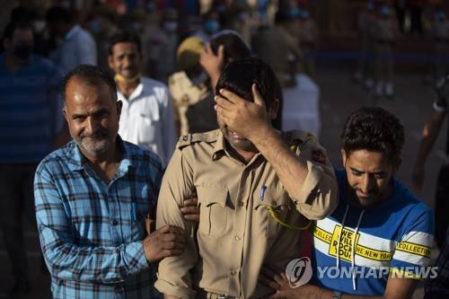 An Indian policeman weeps during a wreath laying ceremony of his colleague Arshad Mir in Srinagar, India, Sunday, Sept. 12, 2021. Mir was killed in an attack which police have blamed on rebels fighting against Indian rule. (AP Photo/Mukhtar Khan)