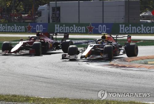 epa09463533 Mexican Formula One driver Sergio Perez (R) of Red Bull Racing and Spanish Formula One driver Carlos Sainz of Scuderia Ferrari Mission Winnow in action during the start of the Formula One Grand Prix of Italy at the Autodromo Nazionale Monza race track in Monza, Italy, 12 September 2021. EPA/MATTEO BAZZI