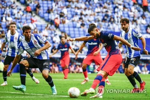 Atletico Madrid's Yannick Carrasco, right, kicks the ball to score his side's second goal during the Spanish La Liga soccer match between RCD Espanyol and Atletico Madrid at the Cornella-El Prat stadium in Barcelona, Spain, Sunday, Sept. 12, 2021. (AP Photo/Joan Monfort)