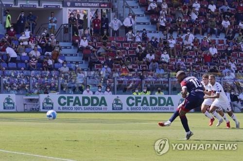 Cagliari's Joao Pedro scores his side's first goal during the Italian Serie A soccer match between Cagliari and Genoa at the Unipol Domus Stadium in Cagliari, Italy, Sunday, Sept. 12, 2021. (Alessandro Tocco/LaPresse via AP) ITALY OUT;