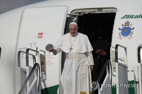 Pope Francis arrives at Bratislava, Slovakia, international airport Sunday, Sept. 12, 2021. Francis is opening his first foreign trip since undergoing major intestinal surgery in July, embarking on an intense, four-day, two-nation trip to Hungary and Slovakia that he has admitted might be overdoing it. (AP Photo/Petr David Josek)