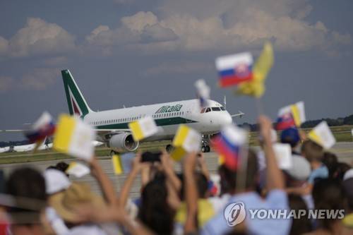 Pope Francis' airplane arrives at Bratislava, Slovakia, international airport Sunday, Sept. 12, 2021. Francis is opening his first foreign trip since undergoing major intestinal surgery in July, embarking on an intense, four-day, two-nation trip to Hungary and Slovakia that he has admitted might be overdoing it. (AP Photo/Petr David Josek)