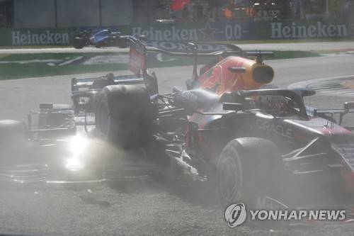 Red Bull driver Max Verstappen of the Netherlands, right and Mercedes driver Lewis Hamilton of Britain crash during the Italian Formula One Grand Prix, at Monza racetrack, in Monza, Italy, Sunday, Sept.12, 2021. (AP Photo/Luca Bruno)