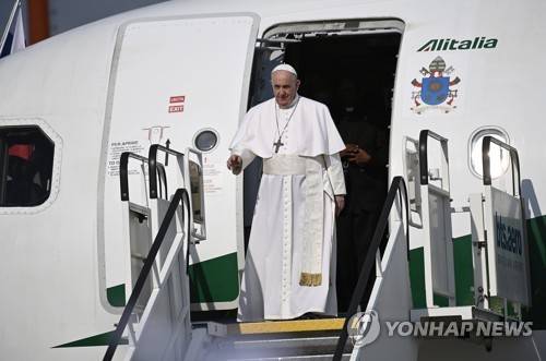 epa09463563 Pope Francis arrives at the Bratislava Letisko Milana Rastislava Stefanika International Airport in Bratislava, Slovakia, 12 September 2021. EPA/CHRISTIAN BRUNA
