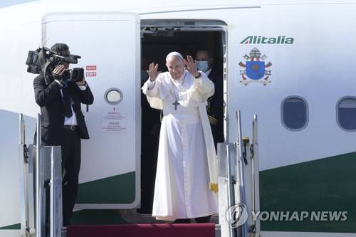 epa09463566 Pope Francis waves as he leaves the Budapest Liszt Ferenc International Airport in Budapest, Hungary, 12 September 2021. Pope Francis celebrated the final mass of the International Eucharistic Congress. EPA/Szilard Koszticsak HUNGARY OUT