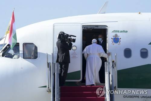 epa09463570 Pope Francis boards an airplane as he leaves the Budapest Liszt Ferenc International Airport in Budapest, Hungary, 12 September 2021. Pope Francis celebrated the final mass of the International Eucharistic Congress. EPA/Szilard Koszticsak HUNGARY OUT