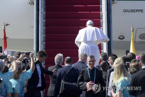 epa09463569 Pope Francis boards an airplane as he leaves the Budapest Liszt Ferenc International Airport in Budapest, Hungary, 12 September 2021. Pope Francis celebrated the final mass of the International Eucharistic Congress. EPA/Szilard Koszticsak HUNGARY OUT
