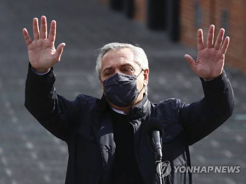 Argentina's President Alberto Fernandez gestures to press members after he voted for mid term primary election in a poll station in Buenos Aires, Argentina, Sunday, Sept. 12, 2021. The country's mid term ballot will be held on Nov. 14, 2021. (AP Photo/Marcos Brindicci). (AP Photo/Marcos Brindicci).