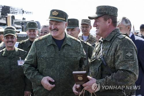 Belarusian President Alexander Lukashenko, center, and high level Russian and Belarusian officers attend the joint strategic exercises of the armed forces of the Russian Federation and the Republic of Belarus Zapad-2021 at the Obuz-Lesnovsky training ground, Belarus, Sunday, Sept. 12, 2021. The military drills attend by servicemen of military units and divisions of the Western Military District, representatives of the leadership headquarters and personnel of military contingents of the armed forces of Armenia, Belarus, India, Kazakhstan, Kyrgyzstan and Mongolia. (BelTA Pool Photo via AP) AP PROVIDES ACCESS TO THIS PUBLICLY DISTRIBUTED HANDOUT PHOTO PROVIDED BY RUSSIAN DEFENSE MINISTRY ; MANDATORY CREDIT.