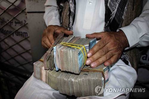 epa09463586 A currency exchange dealer counts Afganis as people gather to withdraw money from a bank in Kabul, Afghanistan, 12 September 2021. The country has been experiencing a severe humanitarian crisis as people have no job or income and many were forced to sell their belongings for food. Banks have resumed operations with limited cash flow. EPA/STRINGER