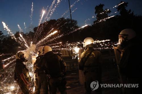 epaselect epa09462634 Clashes between anti-vaccine protesters and riot police outside the area where the inauguration of the 85th Thessaloniki International Fair (TIF) is taking place, in Thessaloniki, Greece, 11 September 2021. EPA/DIMITRIS TOSIDIS