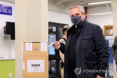 epa09463598 Handout picture provided by Argentinian Presidency that shows Argentine President Alberto Fernandez voting during the legislative primary elections in Buenos Aires, Argentina on 12 September 2021. EPA/ESTEBAN COLLAZO HANDOUT EDITORIAL USE ONLY ONLY AVAILABLE TO ILLUSTRATE THE ACCOMPANYING NEWS (MANDATORY CREDIT) HANDOUT EDITORIAL USE ONLY/NO SALES