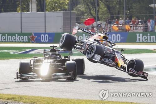 epa09463600 Dutch Formula One driver Max Verstappen (R) of Red Bull Racing collides with British Formula One driver Lewis Hamilton (L) of Mercedes-AMG Petronas during the Formula One Grand Prix of Italy at the Autodromo Nazionale Monza race track in Monza, Italy, 12 September 2021. EPA/MATTEO BAZZI