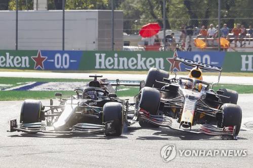epa09463601 Dutch Formula One driver Max Verstappen (R) of Red Bull Racing collides with British Formula One driver Lewis Hamilton (L) of Mercedes-AMG Petronas during the Formula One Grand Prix of Italy at the Autodromo Nazionale Monza race track in Monza, Italy, 12 September 2021. EPA/MATTEO BAZZI