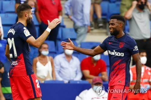 Atletico Madrid's Thomas Lemar, right, celebrates with his teammate Atletico Madrid's Yannick Carrasco after scoring his side's second goal during the Spanish La Liga soccer match between RCD Espanyol and Atletico Madrid at the Cornella-El Prat stadium in Barcelona, Spain, Sunday, Sept. 12, 2021. (AP Photo/Joan Monfort)