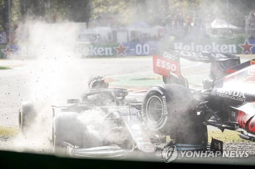 epa09463611 Dutch Formula One driver Max Verstappen (R) of Red Bull Racing collides with British Formula One driver Lewis Hamilton (L) of Mercedes-AMG Petronas during the Formula One Grand Prix of Italy at the Autodromo Nazionale Monza race track in Monza, Italy, 12 September 2021. EPA/MATTEO BAZZI