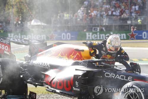 epa09463613 Dutch Formula One driver Max Verstappen of Red Bull Racing gets out of his car after colliding with British Formula One driver Lewis Hamilton (L) of Mercedes-AMG Petronas during the Formula One Grand Prix of Italy at the Autodromo Nazionale Monza race track in Monza, Italy, 12 September 2021. EPA/MATTEO BAZZI