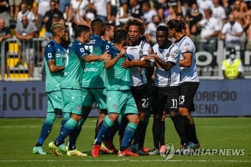 epa09463641 Brawl between Udinese and Spezia players during the Italian Serie A soccer match Spezia Calcio vs Udinese Calcio at the Alberto Picco stadium in La Spezia, Italy, 12 September 2021. EPA/FABIO FAGIOLINI