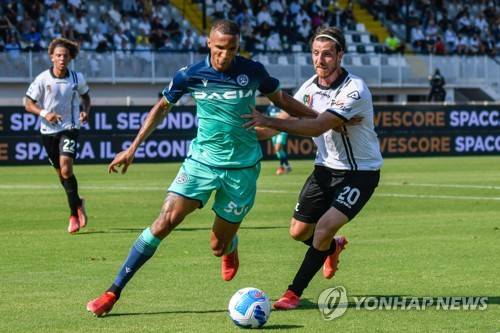 epa09463643 Udinese's Rodrigo Becao (L) against Spezia's Simone Bastoni during the Italian Serie A soccer match Spezia Calcio vs Udinese Calcio at the Alberto Picco stadium in La Spezia, Italy, 12 September 2021. EPA/FABIO FAGIOLINI
