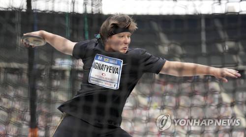 Authorised Neutral Athlete Violetta Ignateva competes in the women's discus throw during the 100th ISTAF athletics meeting at the Olympic Stadium in Berlin, Germany, Sunday, Sept. 13, 2021. (AP Photo/Michael Sohn)