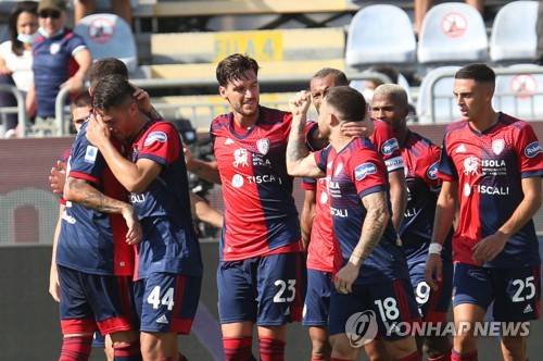 epa09463661 Cagliari's Luca Ceppitelli (3-L) jubilates after scoring his team's second goal during the Italian Serie A soccer match Cagliari Calcio vs Genoa CFC at Unipol Domus stadium in Cagliari, Italy, 12 September 2021. EPA/FABIO MURRU