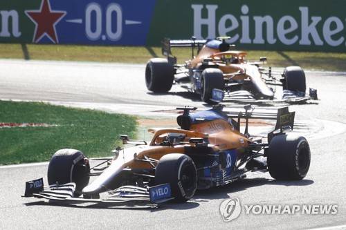 epa09463665 Australian Formula One driver Daniel Ricciardo (front) of McLaren F1 Team and British Formula One driver Lando Norris of McLaren F1 Team in action during the Formula One Grand Prix of Italy at the Autodromo Nazionale Monza race track in Monza, Italy, 12 September 2021. EPA/MATTEO BAZZI