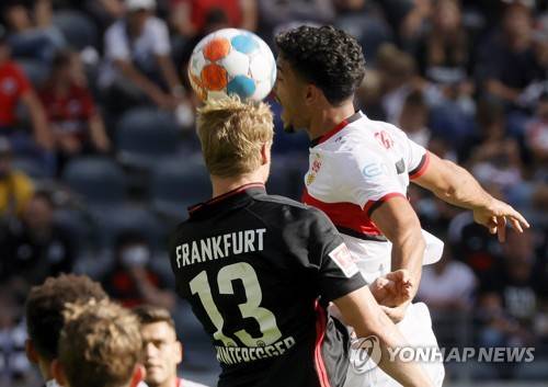 epa09463671 Frankfurt's Martin Hinteregger (L) in action against Stuttgart's Omar Marmoush (R) during the German Bundesliga soccer match between Eintracht Frankfurt and VfB Stuttgart in Frankfurt, Germany, 12 September 2021. EPA/RONALD WITTEK CONDITIONS - ATTENTION: The DFL regulations prohibit any use of photographs as image sequences and/or quasi-video.