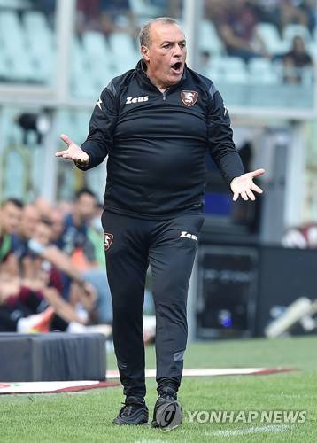 epa09463688 Salernitana?s coach Fabrizio Castori gestures during the Italian Serie A soccer match Torino FC vs US Salernitana at Olimpico Grande Torino Stadium in Turin, Italy, 12 september 2021. EPA/ALESSANDRO DI MARCO