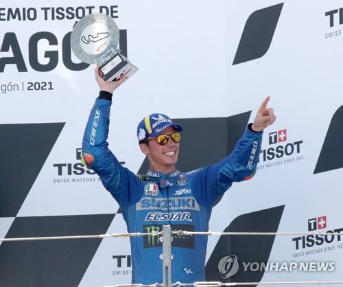 epa09463691 Spanish MotoGP rider Joan Mir of the Suzuki GSX RR Team celebrates on the podium after taking the third place in the Motorcycling Grand Prix of Aragon at Motorland Aragon circuit in Alcaniz, Spain, 12 September 2021. EPA/Javier Cebollada