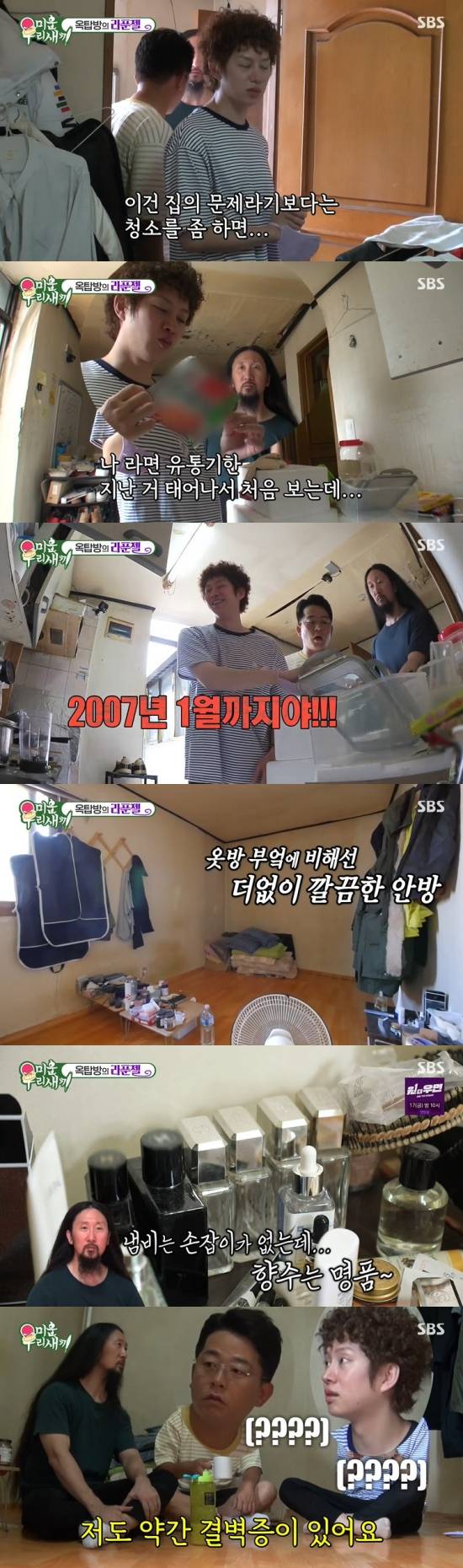 김준호는 "이건 어디 박물관에 넣어야겠다. 이걸 왜 갖고 있냐"라며 웃음을 터트렸다. 찬장에는 유통기한이 2007년 1월까지인 비빔라면도 있었고, 가스레인지 근처에는 기름때가 낀 탓에 벌레 시체가 쌓여 있었다. 영상을 지켜보던 서장훈은 "힘들다"라며 괴로워했다.