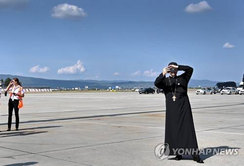 epa09463693 A Slovak priest takes a photo with his cell phone prior to Pope Francis arrival at the international airport in Bratislava, Slovakia, 12 September 2021. Pope Francis is on a three days visit to Slovakia, under the official motto: 'With Mary and Joseph on the way to Jesus'. EPA/CHRISTIAN BRUNA