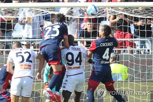 epa09463700 Cagliari's Luca Ceppitelli (2-L) scores his team's second goal during the Italian Serie A soccer match Cagliari Calcio vs Genoa CFC at Unipol Domus stadium in Cagliari, Italy, 12 September 2021. EPA/FABIO MURRU