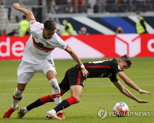 epa09463698 Frankfurt's Jesper Lindstrom (R) in action against Stuttgart's Atakan Karazor (L) during the German Bundesliga soccer match between Eintracht Frankfurt and VfB Stuttgart in Frankfurt, Germany, 12 September 2021. EPA/RONALD WITTEK CONDITIONS - ATTENTION: The DFL regulations prohibit any use of photographs as image sequences and/or quasi-video.
