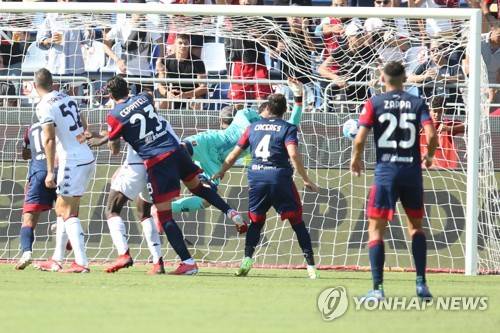 epa09463702 Cagliari's Luca Ceppitelli (2-L) scores his team's second goal during the Italian Serie A soccer match Cagliari Calcio vs Genoa CFC at Unipol Domus stadium in Cagliari, Italy, 12 September 2021. EPA/FABIO MURRU