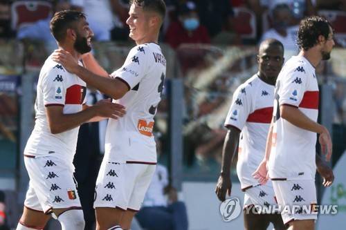 epa09463724 Genoa's Mohamed Fares (L) jubilates with his teammates after scoring his team's third goal during the Italian Serie A soccer match Cagliari Calcio vs Genoa CFC at Unipol Domus stadium in Cagliari, Italy, 12 September 2021. EPA/FABIO MURRU