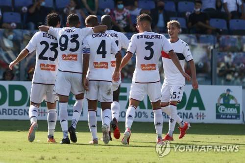 epa09463723 Genoa's Mohamed Fares (2-L) jubilates with his teammates after scoring his team's third goal during the Italian Serie A soccer match Cagliari Calcio vs Genoa CFC at Unipol Domus stadium in Cagliari, Italy, 12 September 2021. EPA/FABIO MURRU
