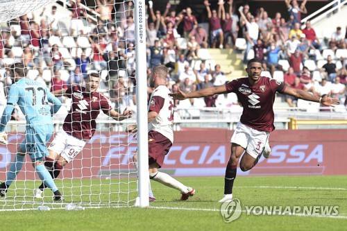 Torino's Bremer celebrates after scoring his side's second goal during the Italian Serie A soccer match between Torino and Salernitana at the Olimpico Grande Torino Stadium in Turin, Italy, Sunday, Sept. 12, 2021, (Claudio Grassi/LaPresse via AP) ITALY OUT;