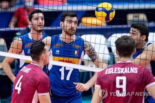 epa09463742 Simone Anzani of Italy (C) during the EuroVolley 2021 Men Round of 8 match between Italy and Latvia in Ostrava, Czech Republic, 12 September 2021. EPA/LUKAS KABON