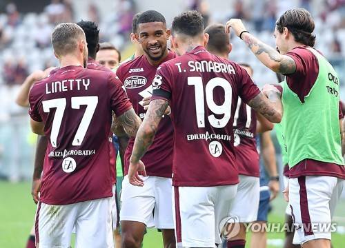 epa09463752 Torino?s Gleison Bremer (C) jubilates after scoring his team's second goal during the Italian Serie A soccer match Torino FC vs US Salernitana at Olimpico Grande Torino Stadium in Turin, Italy, 12 september 2021. EPA/ALESSANDRO DI MARCO