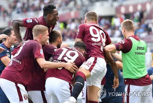 epa09463751 Torino players celebrate their second goal during the Italian Serie A soccer match Torino FC vs US Salernitana at Olimpico Grande Torino Stadium in Turin, Italy, 12 september 2021. EPA/ALESSANDRO DI MARCO