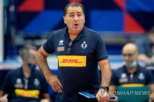 epa09463862 Head coach od Italy Ferdinando De Giorgi reacts during the EuroVolley 2021 Men Round of 8 match between Italy and Latvia in Ostrava, Czech Republic, 12 September 2021. EPA/LUKAS KABON