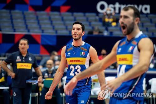 epa09463863 Giulio Pinali of Italy reacts during the EuroVolley 2021 Men Round of 8 match between Italy and Latvia in Ostrava, Czech Republic, 12 September 2021. EPA/LUKAS KABON