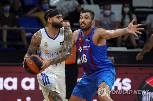 epa09464046 Barcelona's Pierre Oriola (R) in action against Real Madrid's Jeff Taylor (L) during the Spanish ACB Supercup final basketball match between FC Barcelona and Real Madrid at Santiago Marin arena in Santa Cruz de Tenerife, Canary islands, Spain, 12 September 2021. EPA/Ramon de la Rocha