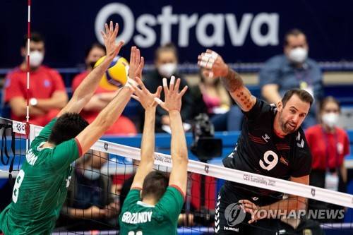 epa09464131 Todor Skrimov (L) and Aleks Grozdanov of Bulgaria (C) in action against Gyorgy Grozer of Germany (R) during the EuroVolley 2021 Men Round of 8 match between Germany and Bulgaria in Ostrava, Czech Republic, 12 September 2021. EPA/LUKAS KABON