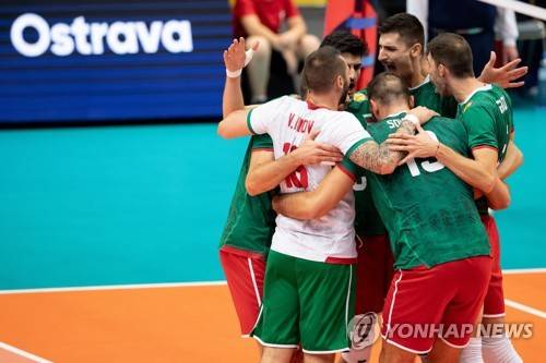 epa09464134 Bulgaria team celebrate during the EuroVolley 2021 Men Round of 8 match between Germany and Bulgaria in Ostrava, Czech Republic, 12 September 2021. EPA/LUKAS KABON